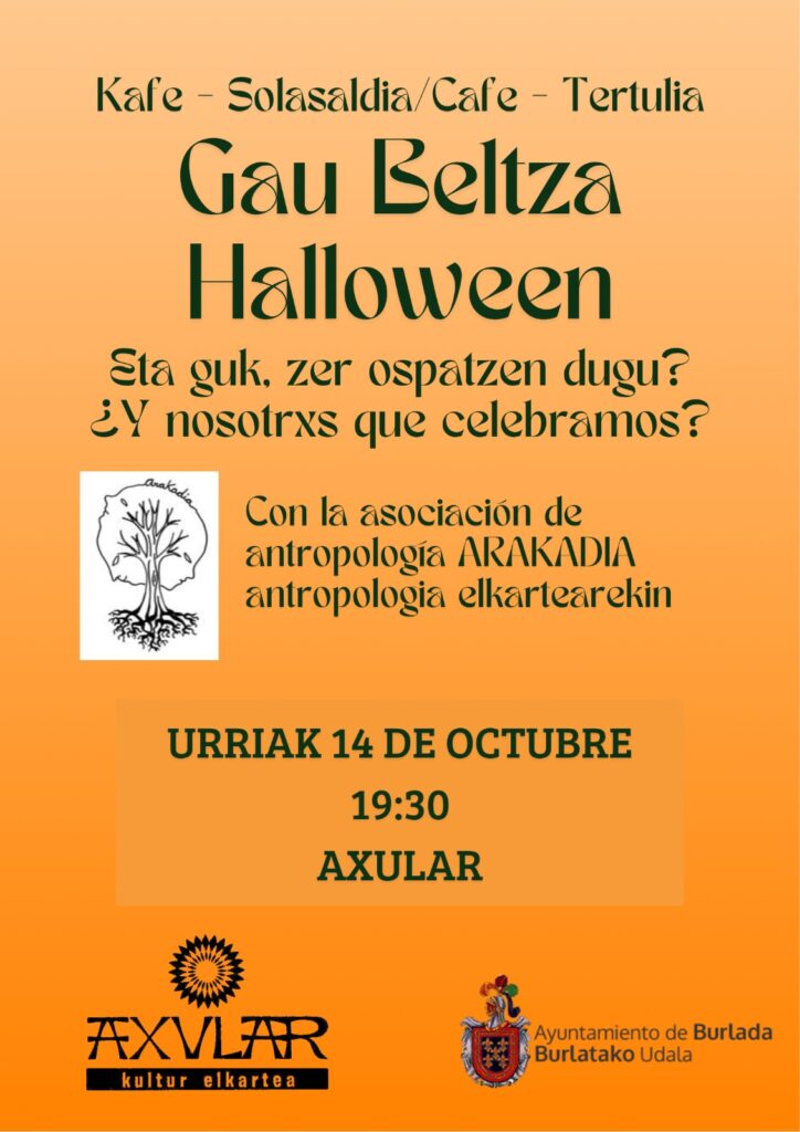 Axular kultur elkarteak, Burlatako kultur jardueren barruan, Gau Beltzari buruzko jardunaldi bat antolatu du urriaren 14an, 19:30ean, kultur elkarte berean. Horretarako Arakadiaren laguntza eskatu du eta horixe egingo dugu. Formatuaren oinarria 2022ko urriaren 18ko Plazara kafetegiko solasaldia izango da. Josu Oteiza eta Jaime Altuna antropologoek egindako “Gau Beltza” dokumentala erakutsiko dugu. Ideien eztabaidan ekimenak sortzea nahi dugu, ospakizun hori Burlatan egin dadin, aurretik gonbidatuak izan diren hainbat kolektiboren parte-hartzearekin.